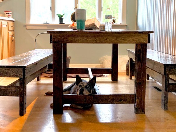 Everyday we eat together at this table we made together . Steele will lay under the table and wait for us to finish. You better bet if you drop something he will be there faster than Sonic the hedgehog to clean it up! On this day we had finished eating. I looked over and he was laying like this looking so sad that we hadn’t dropped anything ! Don’t worry he doesn’t miss a meal.